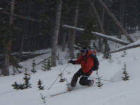 We climbed, all five of us, at a relaxed pace through areas of dense forest and open tree shots. I broke trail for a large portion of the approach and found breakable crust on top of our much-loved DEEP layer of depth hoar at the ground. The breaking was arduous. Thankfully, the wind covered our uptracks quickly to conceal our location.On North facing 25-30 degree slopes at 10,600' (below treeline) we found breakable crust with 5cm of new snow on top. We felt evidence of the wind in even the densest trees on this aspect. We skied one run here before heading south onto NE facing slopes of the same gradient and elevation, where we found consistent, creamy powder on top of a supportable base.